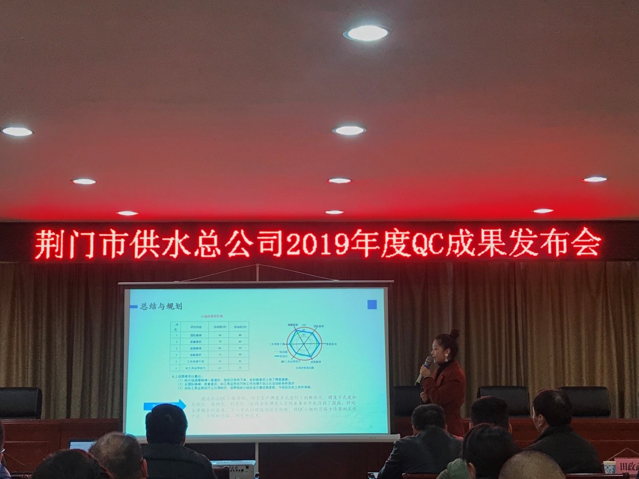 12月6日,荊門市供水總公司首屆QC成果發(fā)布會在總公司六樓會議室順利召開,質(zhì)量專家、國家級評審員劉佐光老師、荊門市質(zhì)量協(xié)會田政武秘書長、公司副總經(jīng)理徐安祥及各部門主要負(fù)責(zé)人參加了發(fā)布會,會議由QC工作組組長劉昕平主持。