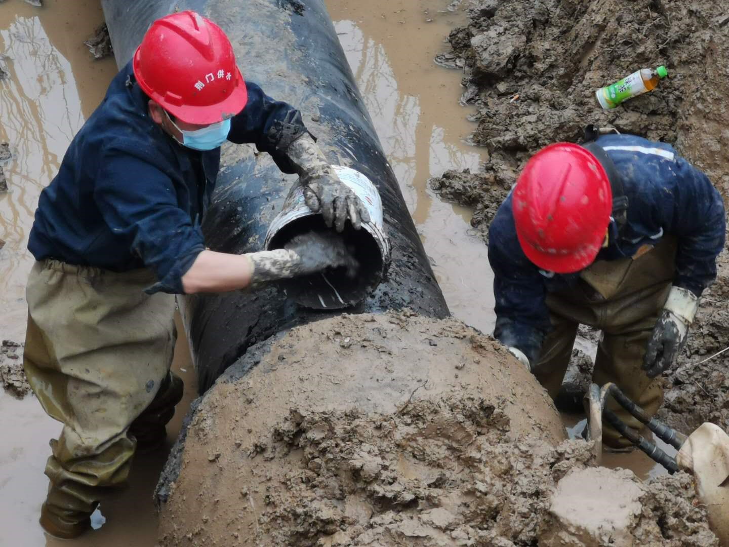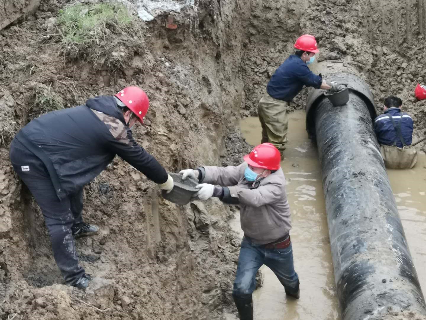 2月23日10時,掇刀區(qū)迎春大道人福藥業(yè)門前DN600mm主供水管道突發(fā)爆管,供水維修部門迅速啟動疫情期間應(yīng)急搶修預(yù)案,組織人員、工程機械、維修設(shè)備趕赴現(xiàn)場,經(jīng)過9個多小時的緊張搶修,于當(dāng)日晚7點42分恢復(fù)了供水。緊接著次日8點,東寶區(qū)科陽路DN600mm主供水管道突發(fā)爆管,巡查人員現(xiàn)場核實后迅速止水,并及時通告用戶停水信息后開始倒閘排水,到13時左右開挖出爆管的DN600的主供水管道出現(xiàn)在大家面前,相比前日的搶修,整段水管因裂口較大損壞嚴(yán)重,不能簡單修復(fù),只能現(xiàn)場立即制定可靠的管道更換維修方案。當(dāng)時,全部工作人員從早上到現(xiàn)場已經(jīng)工作了5個小時,滴水未進,但大家為保障搶修進度,仍然堅持一邊加班加點對基坑進行處理,一鼓作氣將破損管道清理出來,做好對接管道的清淤工作。另一邊搬運快干水泥,切割、加工、運輸、吊裝管道,14點35分把全部材料物資運抵現(xiàn)場開始作業(yè)。隨后,大家在泥地里匆匆啃了幾口方便面后,又投入到緊張的搶修工作中,終于在18點17分完成了維修,待水泥養(yǎng)護好后,于21點27分通水,及時保障了科陽路企業(yè)和周邊居民的正常生產(chǎn)生活用水。