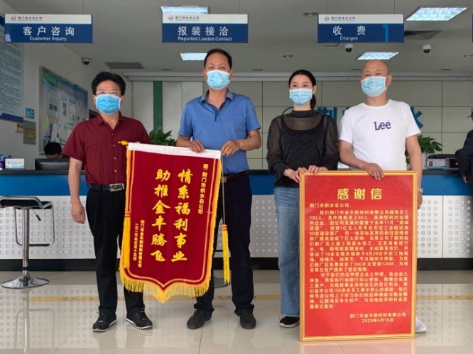 5月15日上午,荊門(mén)市金豐新材料有限公司總經(jīng)理袁家群和東寶區(qū)工商聯(lián)相關(guān)負(fù)責(zé)人來(lái)到市供水總公司,送上感謝信和寫(xiě)有“情系福利事業(yè) 助推金豐騰飛”的鮮艷錦旗,以感謝市供水總公司想企業(yè)之所想、急企業(yè)之所急,用實(shí)際行動(dòng)踐行初心使命,助推企業(yè)復(fù)工復(fù)產(chǎn)。