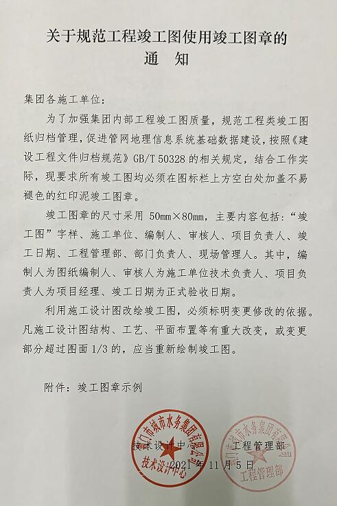 近日,技術(shù)設(shè)計中心為了加強(qiáng)集團(tuán)內(nèi)部工程竣工圖質(zhì)量,規(guī)范工程類竣工圖紙歸檔管理,促進(jìn)管網(wǎng)地理信息系統(tǒng)基礎(chǔ)數(shù)據(jù)建設(shè),聯(lián)合工程管理部編發(fā)了規(guī)范工程竣工圖使用竣工圖章的要求和指導(dǎo)意見。